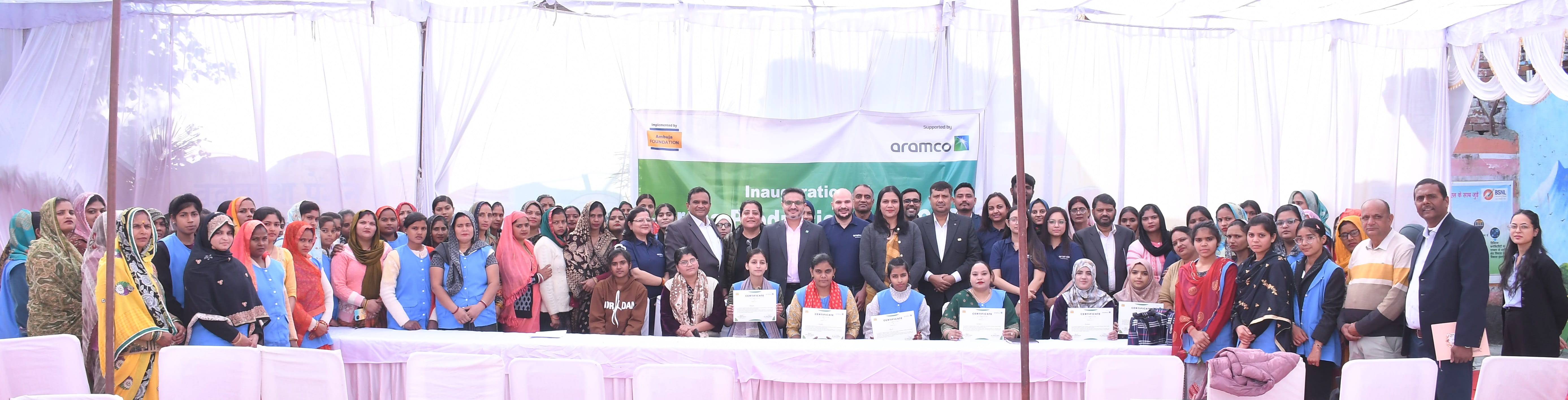 AAI Managing Director Abdulrahman Althukair (center) with the project beneficiaries, NGO partner, and Aramco India team with the top performers’ certificates during the inauguration of Citizenship project Empowering Women - Through the entrepreneurial skill of tailoring
